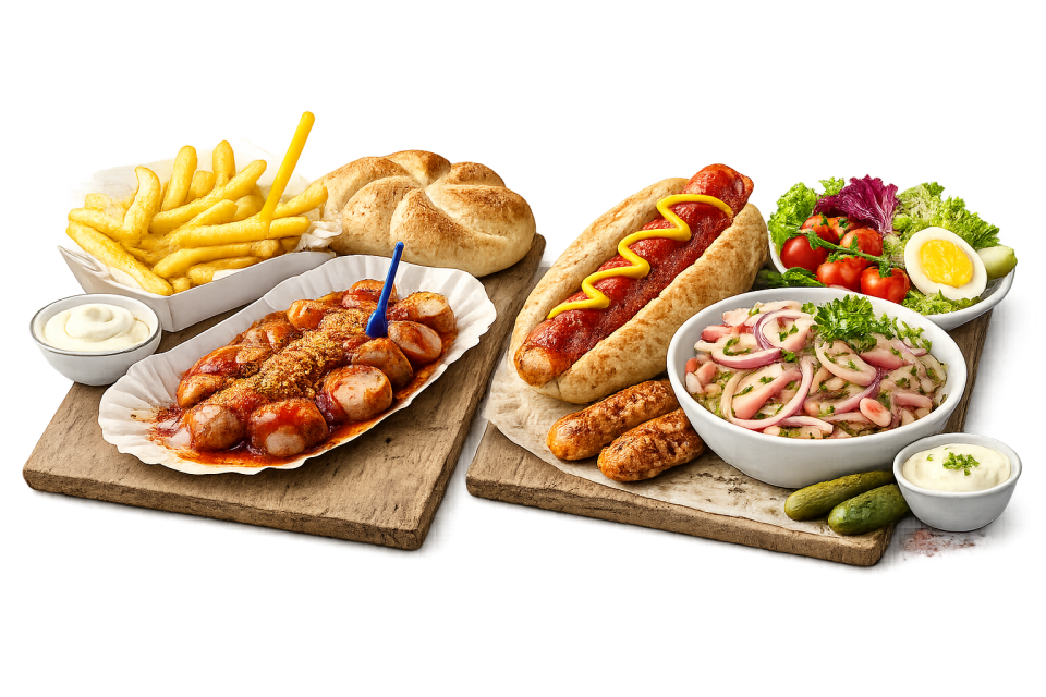 Currywurst mit Pommes, hausgemachter Wurstsalat