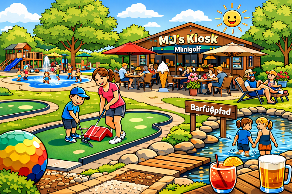 Minigolf, Spielplatz, Frühstücks, Wassertretstelle, Barfußpark, Biergarten, Cocktails, Tischtennis, Boccia, Geburtstage